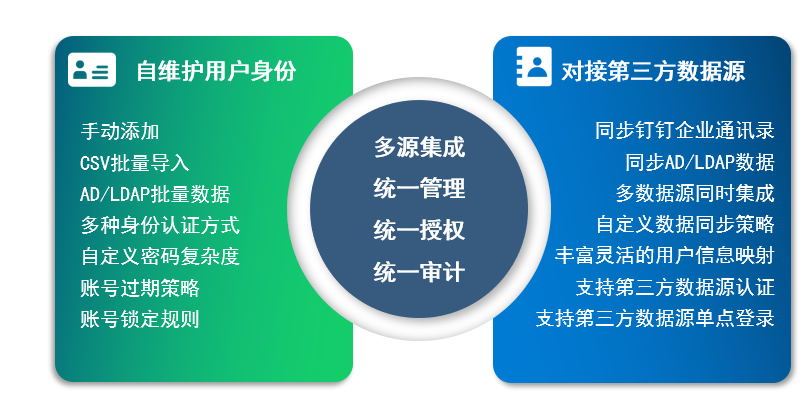 澳门银河网上赌场网站零信任安全管理平台既支持主流企业通讯录系统的数据导入与同步,也支持自建用户体系。实现了在一个平台对企业人员、部门以及角色组的统一高效管理。同时系统提供多种用户认证方式,全方位满足各种需求场景。