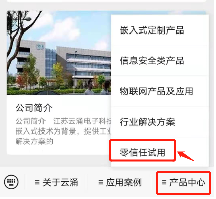 首先关注澳门银河网上赌场官方微信公众号,然后进入【产品中心】菜单,并点击下拉菜单中的【零信任试用】进入试用页面,点击免费试用根据提示操作即可。