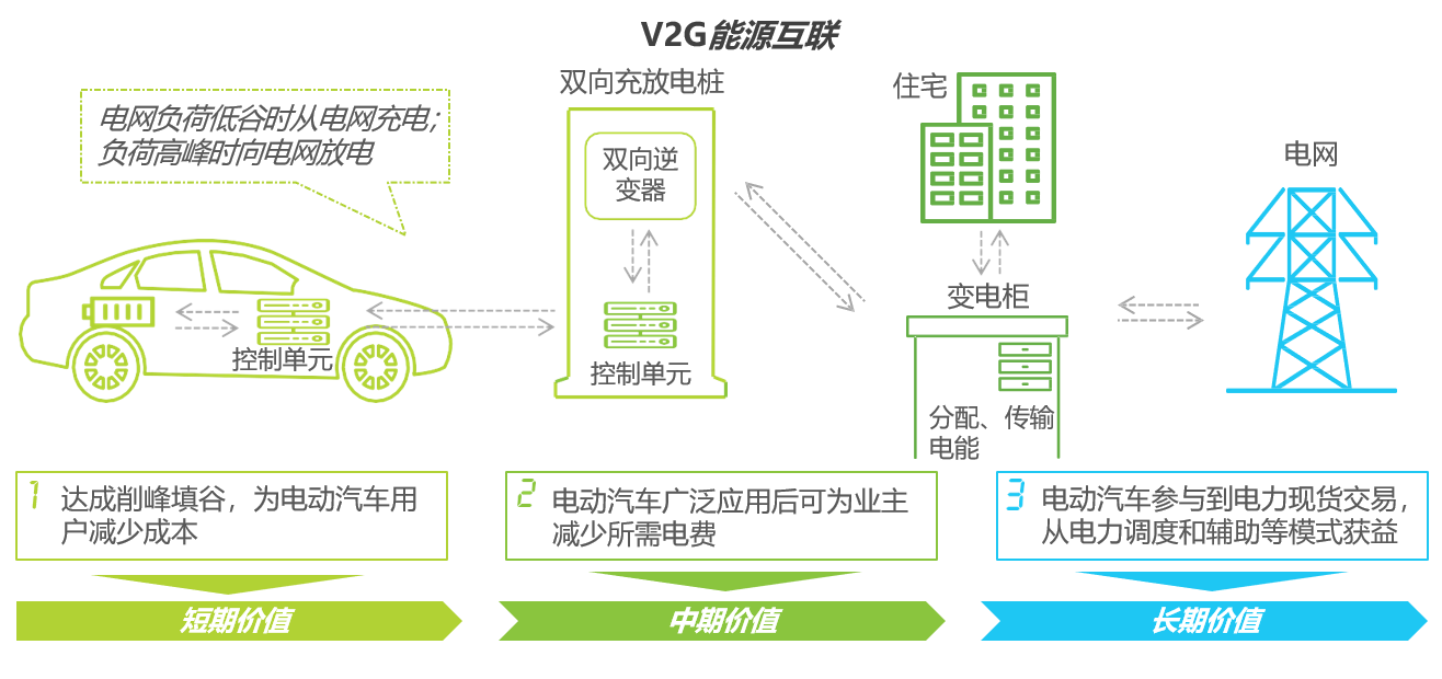 V2G模式试点正在进行:V2G可达成车辆与电网之间的能源互联,实现储能调峰、改善电能质量、调整用电负荷等服务,将成为未来的长期发展方向。