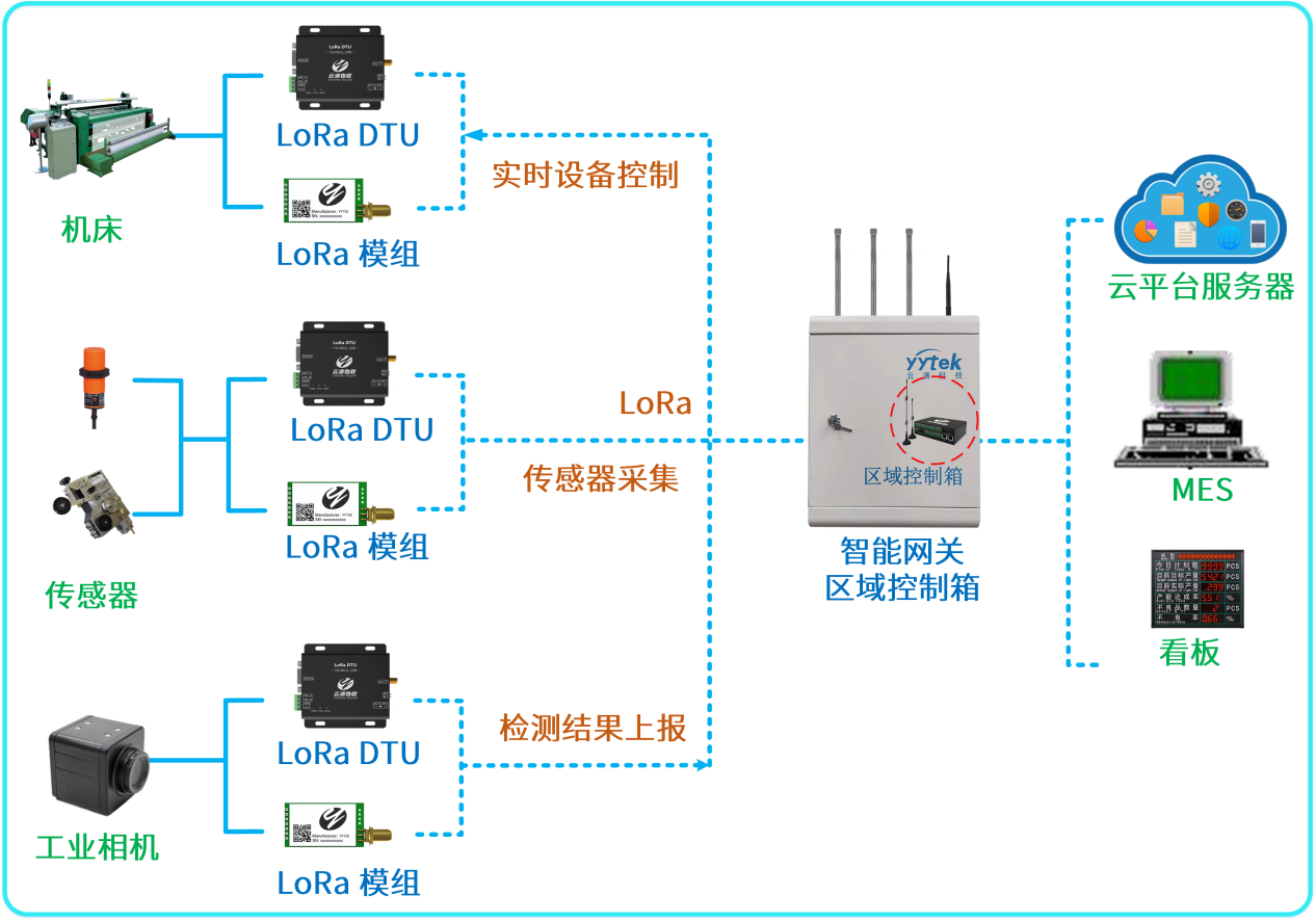 在工厂内的各个终端节点(传感器、工业设备、工业相机)使用LORA DTU和LORA模组升级设备和传感器,使设备具备无线传输能力,实现对生产数据的实时上报和操作指令接收。通过澳门银河网上赌场智能无线网关对着这些终端节点进行数据的采集和接收,再由网关进行数据分析和协议转换,与上层的不同业务系统进行数据的交互。