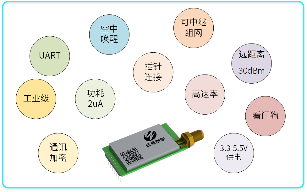 带有UART(TTL)接口,插针方式,可与MCU进行通讯,适合嵌入到智能工业相机等硬件设备中;可与智能网关之间相互通讯,也可模组之间直接通讯
