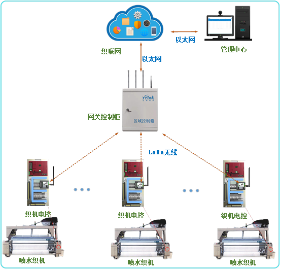 首先,工厂内的各个终端节点(我们称之为“织机电控“)集成LoRa 模组,使设备、传感器具备无线传输能力,实现对生产数据的实时上报和操作指令的接收,一旦工业摄像头通过AI算法识别到织机故障,便可通过LoRa模组及时上传告警信息。然后,LoRa智能无线网关对这些终端节点的数据再进行采集、分析和处理,并上传到织联网平台,最后,机器效率、产量和告警信息等一系列内容就会通过大屏展示,及时提醒管理人员进行设备故障处理。