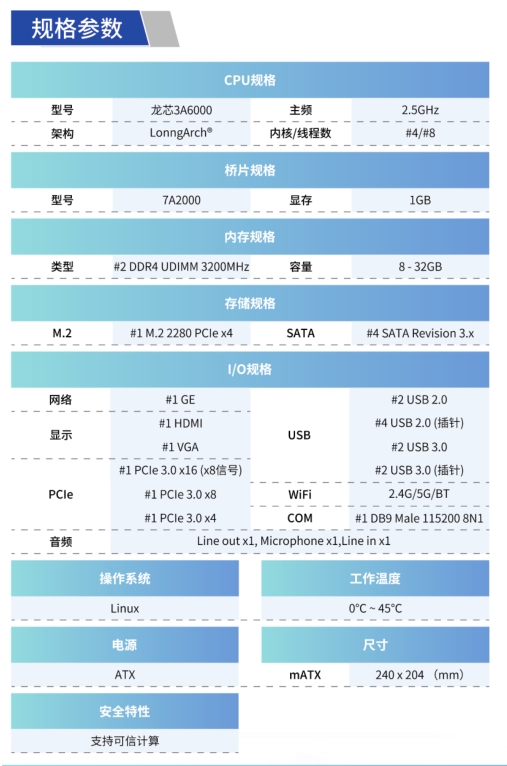 由澳门银河网上赌场网站推出的基于3A6000的系列产品,采用4核处理器构建,主频2.5GHzo,搭配7A2000桥片,1GB独立显存,支持2路UDIMM3200DDR4内存条,支持M.2接口,可作为小容量固态系统盘使用,应用于家用娱乐、商务办公等场景。
