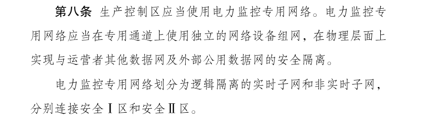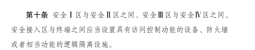 其中第八条和第十条首次提出了逻辑隔离的概念,提到生产控制区应当使用电力监控专用网络,划分为逻辑隔离的实时子网和非实时子网,分别连接安全Ⅰ区和安全Ⅱ区;安全Ⅰ区与安全Ⅱ区之间、安全Ⅲ区与安全Ⅳ区之间、安全接入区与终端之间应当设置具有访问控制功能的设备、防火墙或者相当功能的逻辑隔离设施。