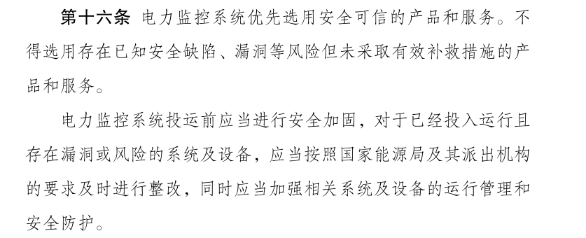 第十六条明确提到:电力监控系统优先选用安全可信的产品和服务。