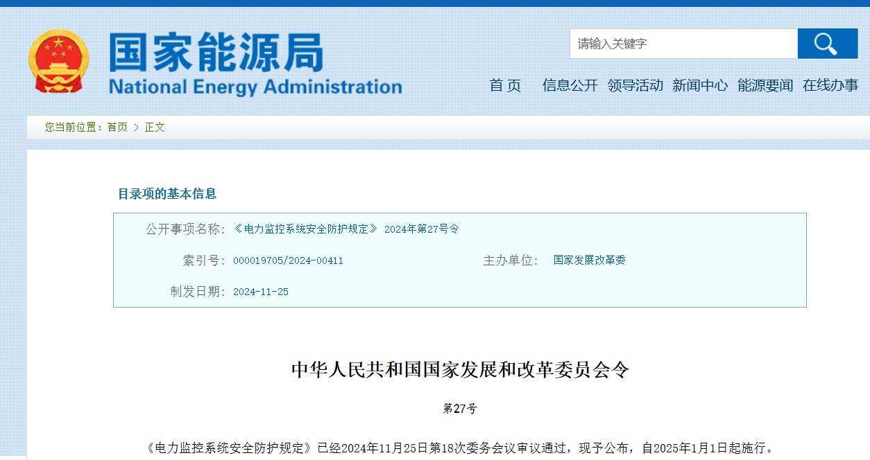 近日,国家发展改革委颁布了新修订的《电力监控系统安全防护规定》(国家发展改革委2024年第27号令,以下简称27号令),自2025年1月1日起施行,原《电力监控系统安全防护规定》(国家发展改革委2014年第14号令,以下简称27号令)同时废止。