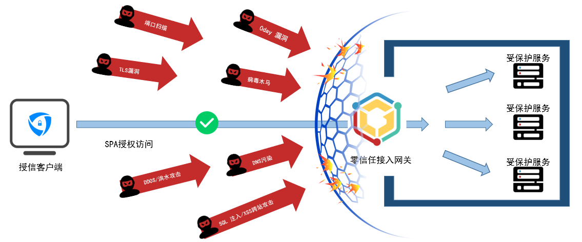 ♦严格的终端单包敲门机制,确保只有认证过的用户及设备才能访问受保护服务;