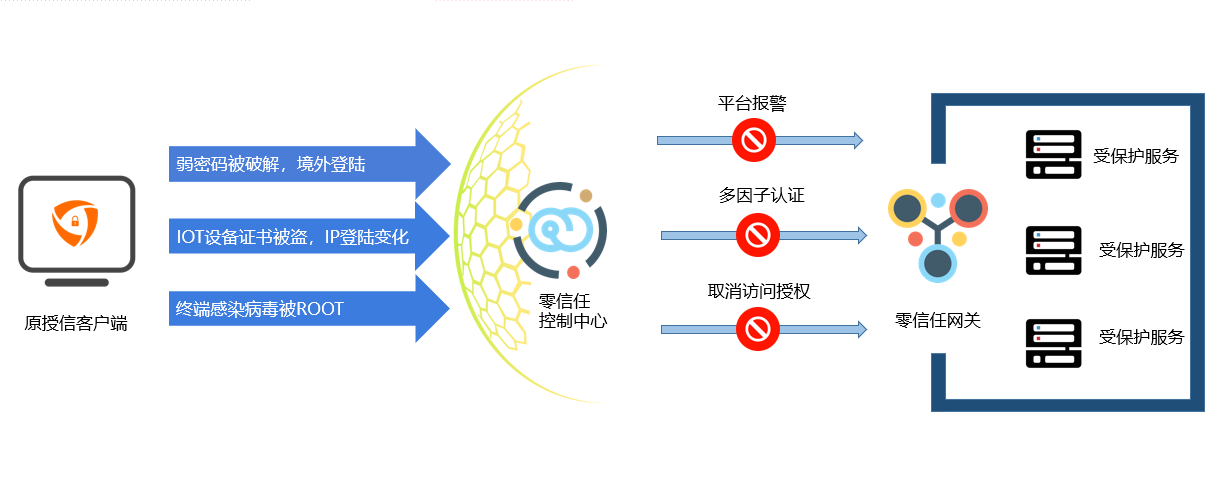 澳门银河网上赌场网站零信任持续侦测终端运行环境,包括操作系统环境及网络环境等。系统针对终端运行环境变化,依据安全基线策略及登录认证策略等,实时响应并触发不同级别的措施如MFA、告警或立即阻断等。