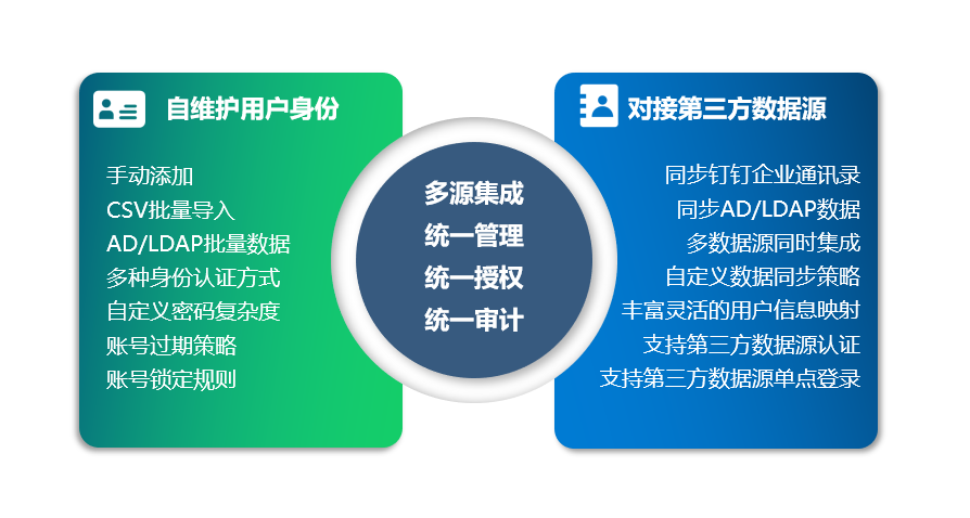 澳门银河网上赌场网站零信任安全管理平台既支持主流企业通讯录系统的数据导入与同步,也支持自建用户体系。实现了在一个平台对企业人员、部门以及角色组的统一高效管理。同时系统提供多种用户认证方式,全方位满足各种需求场景。