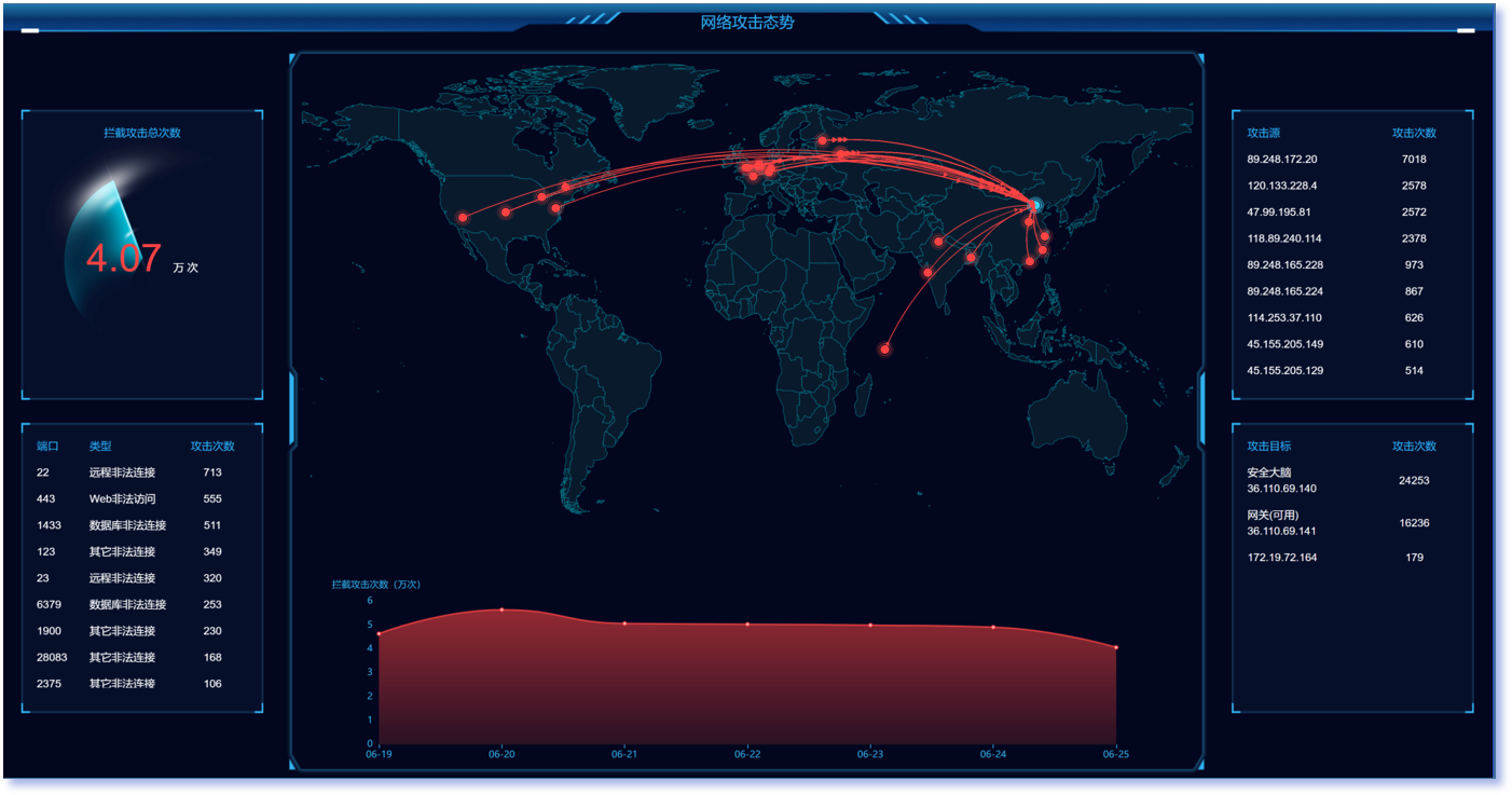 ♦澳门银河网上赌场网站提供了基于零信任系统的网络攻击态势感知,管理端大屏展示从攻击源到攻击目标的实时态势;